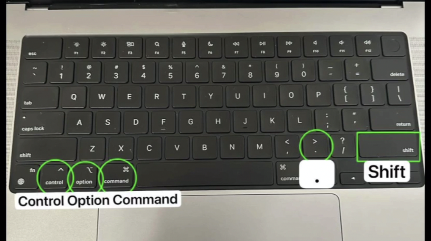 2. Press and hold for 3 seconds LEFT CONTROL + LEFT OPTION + LEFT COMMAND + . + RIGHT SHIFT